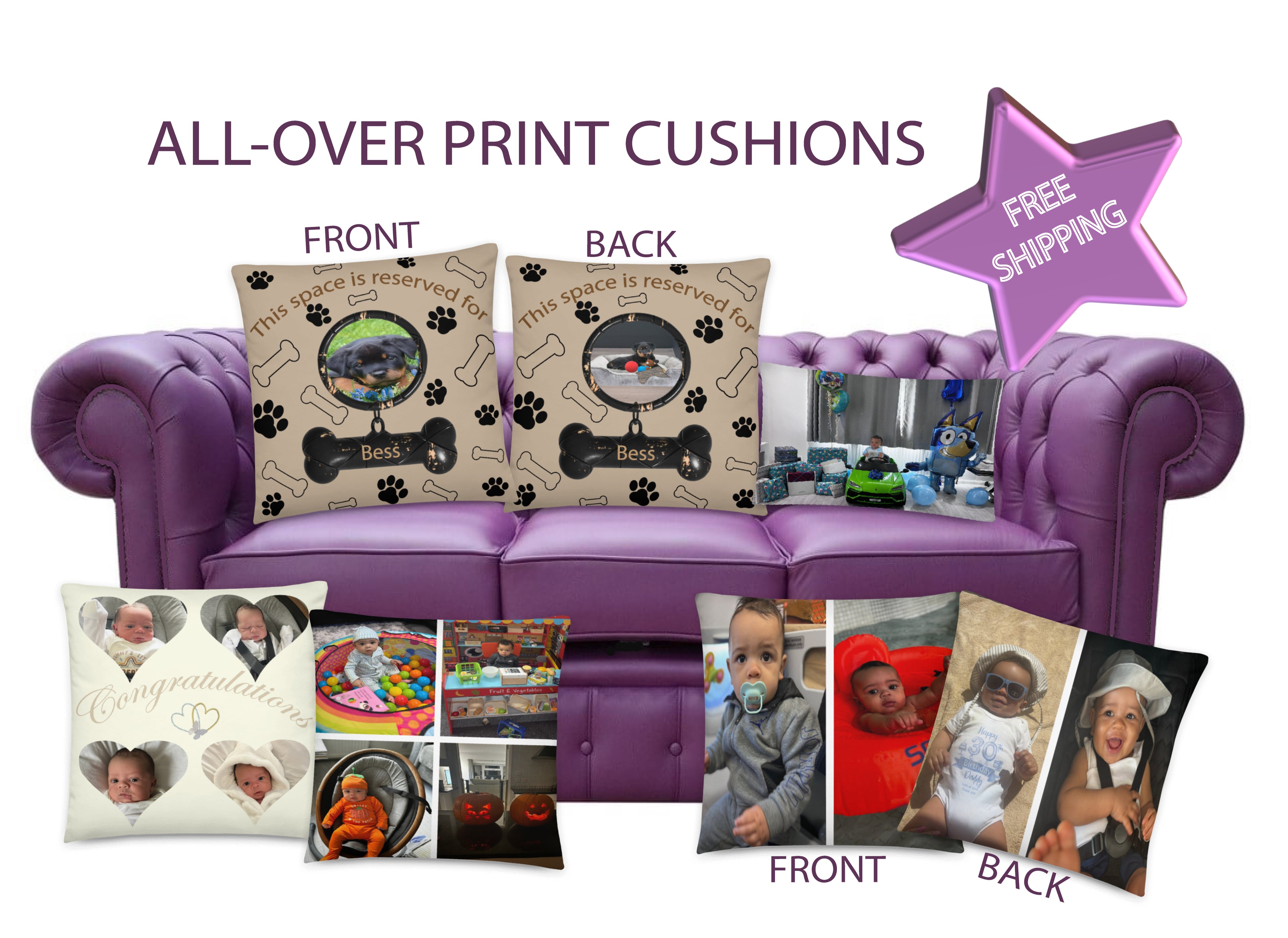 Customise our cushions with your preferred photos on both sides. These all-over print cushions will enrich any room and serve as a cherished keepsake or as a unique gift. Take advantage of free shipping on all orders.